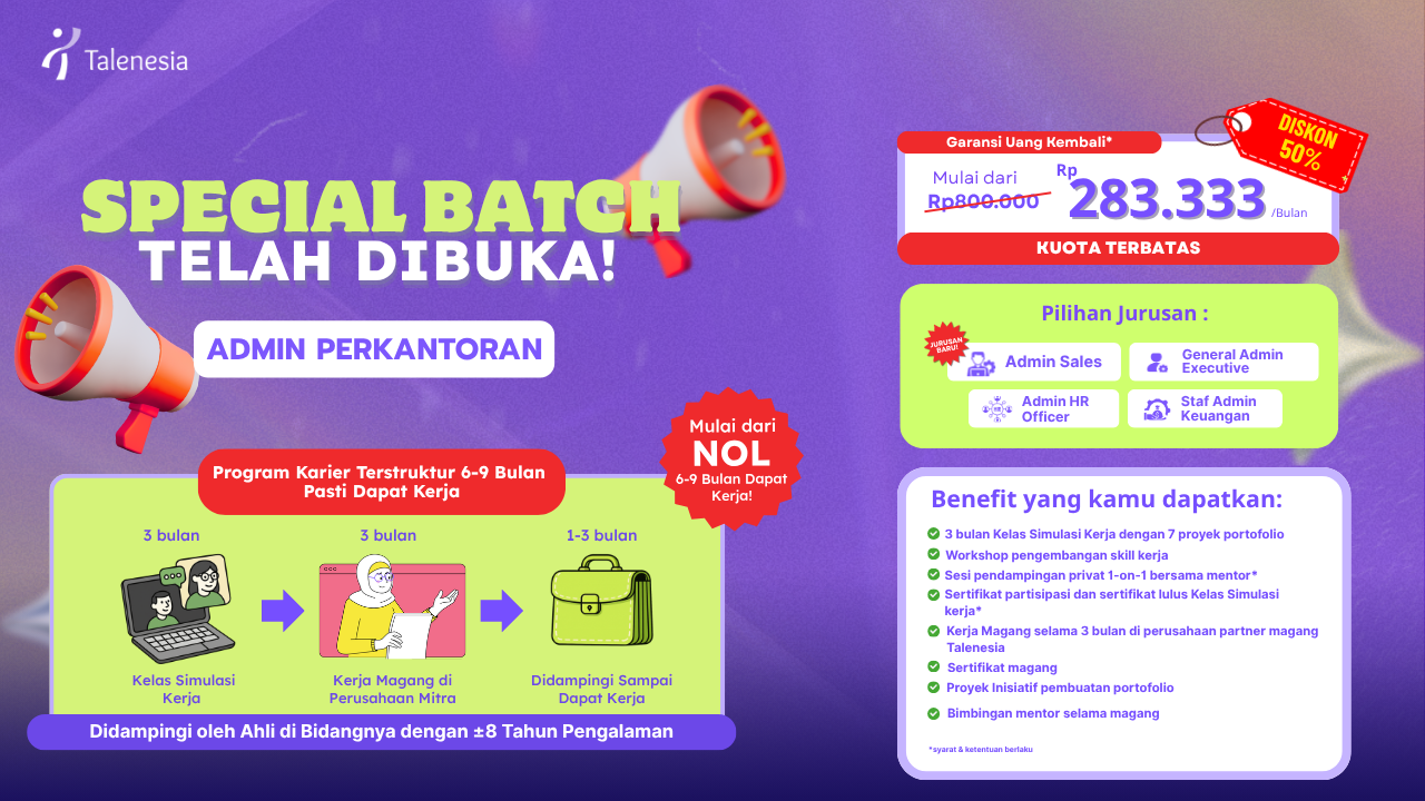 Kenali potensi diri, ikut pelatihan, dan dapatkan bimbingan sampai dapat kerja bersama Talenesia. -